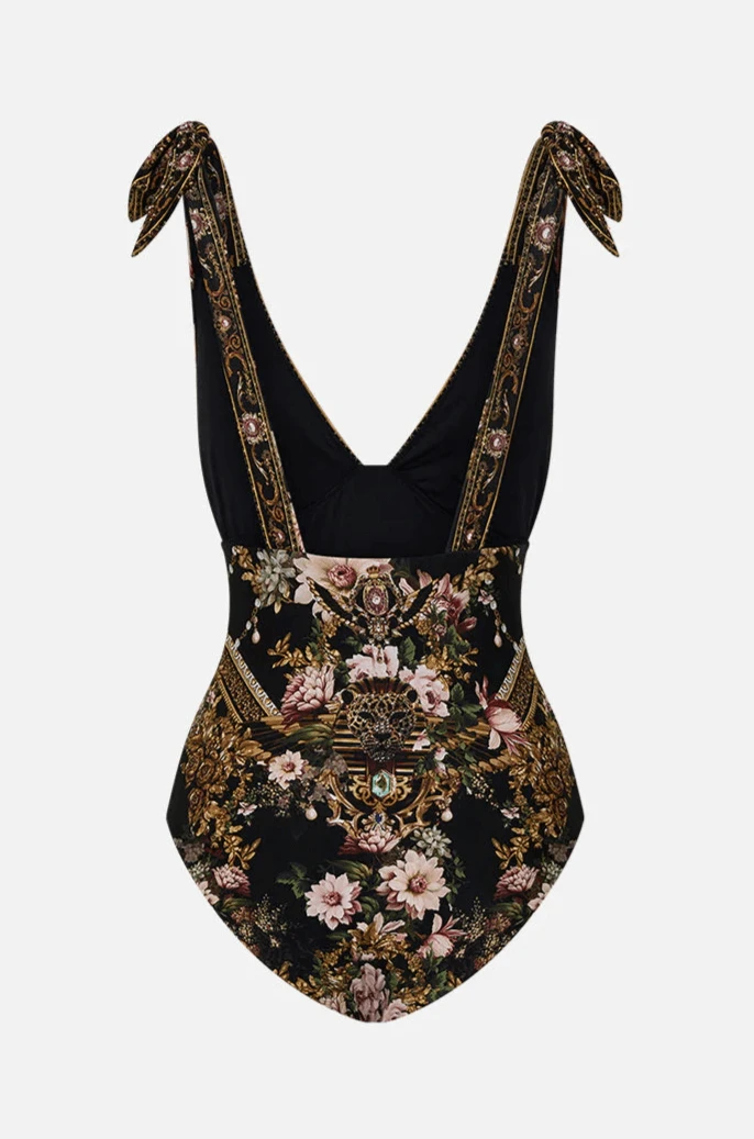 Visit the lavish world of Dynasty Daze in the Ruched Tri-Tie Shoulder One Piece swimsuit. Embrace sustainable luxury with ECONYL® regenerated nylon without neglecting your sensual side. The opulent black fabric is adorned with delicate florals and golden fronds, while hand-embellished CAMILLA crystals add a touch of shimmer. The high-rise lines will define your silhouette, creating an elegant and alluring look.