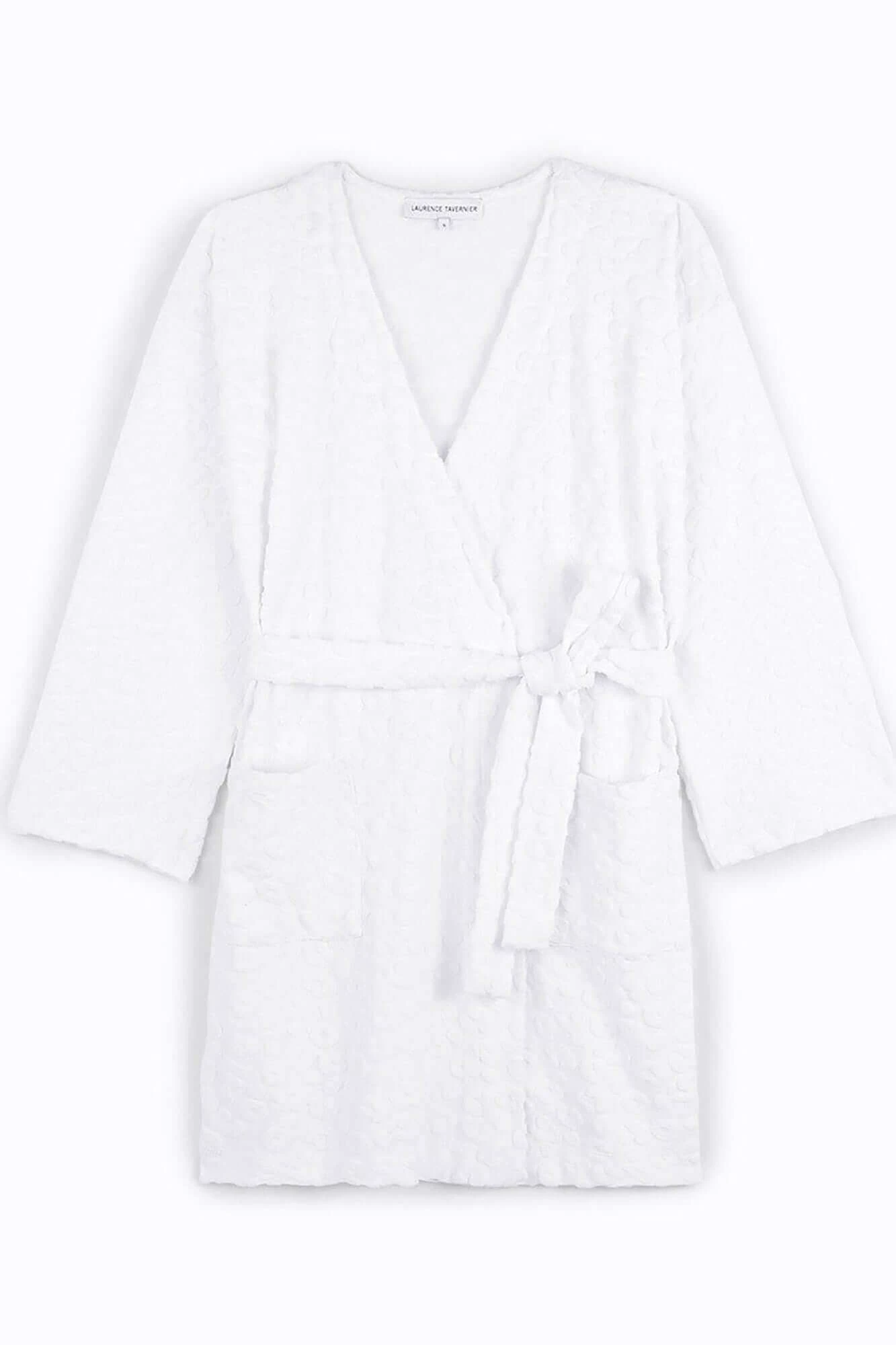 Laurence Tavernier Fauve Short Robe in White. Take a walk on the wild side with Laurence Tavernier’s Fauve kimono, a design enveloped in a tonal jacquard animal print on white terrycloth. A soft, cotton-blend terry cloth in white imbued with modal for a silky finish.