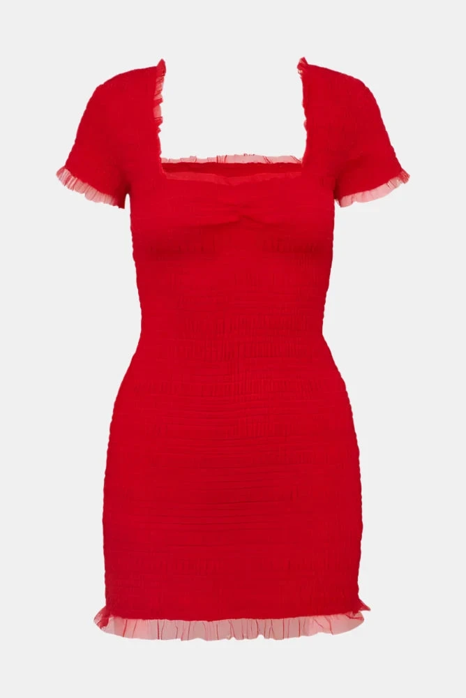 The Esca Dress is a flirty smocked tulle bodycon mini with a scoop neckline, tulle ruffles, front cinching, and a side zipper. Feminine and festive.