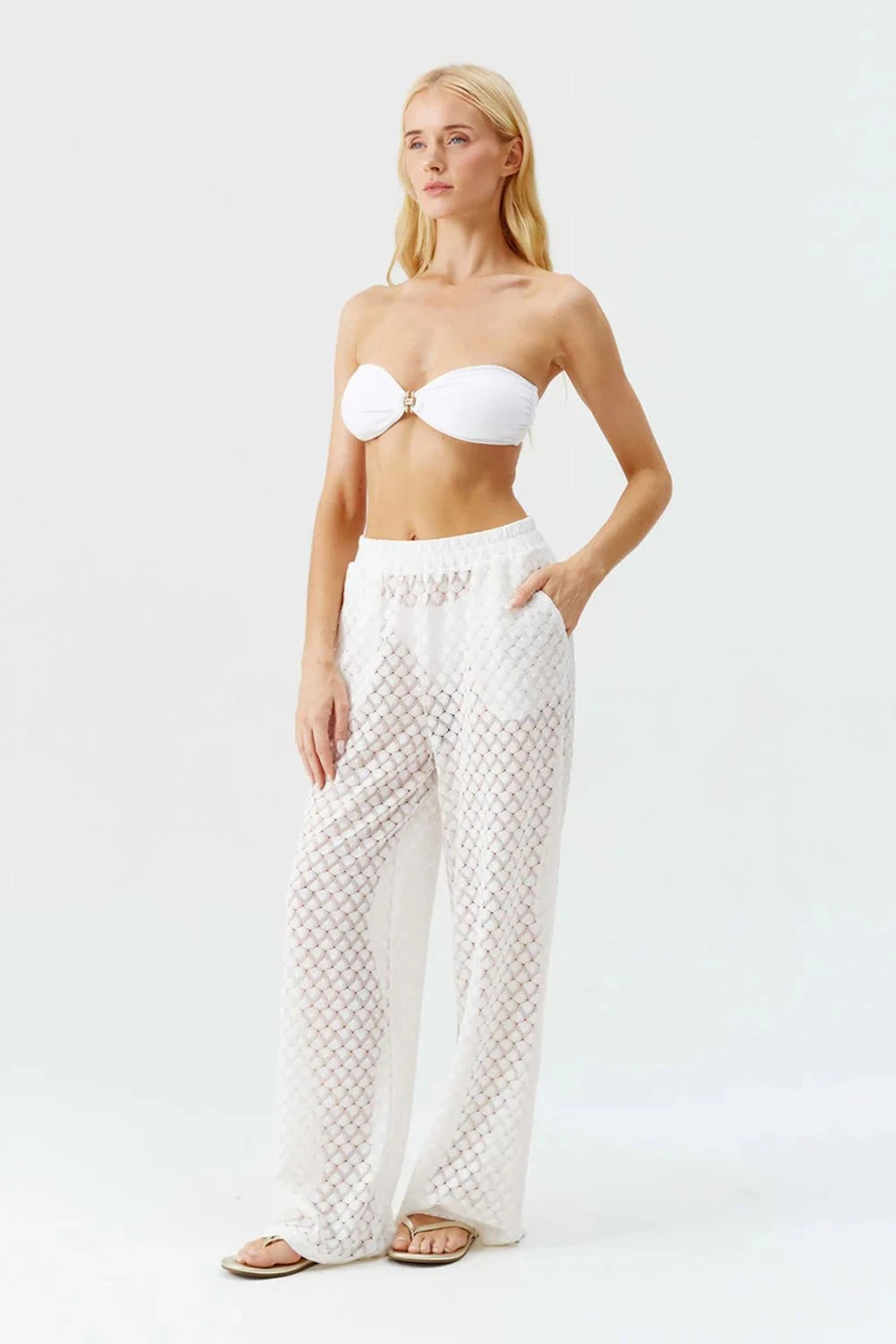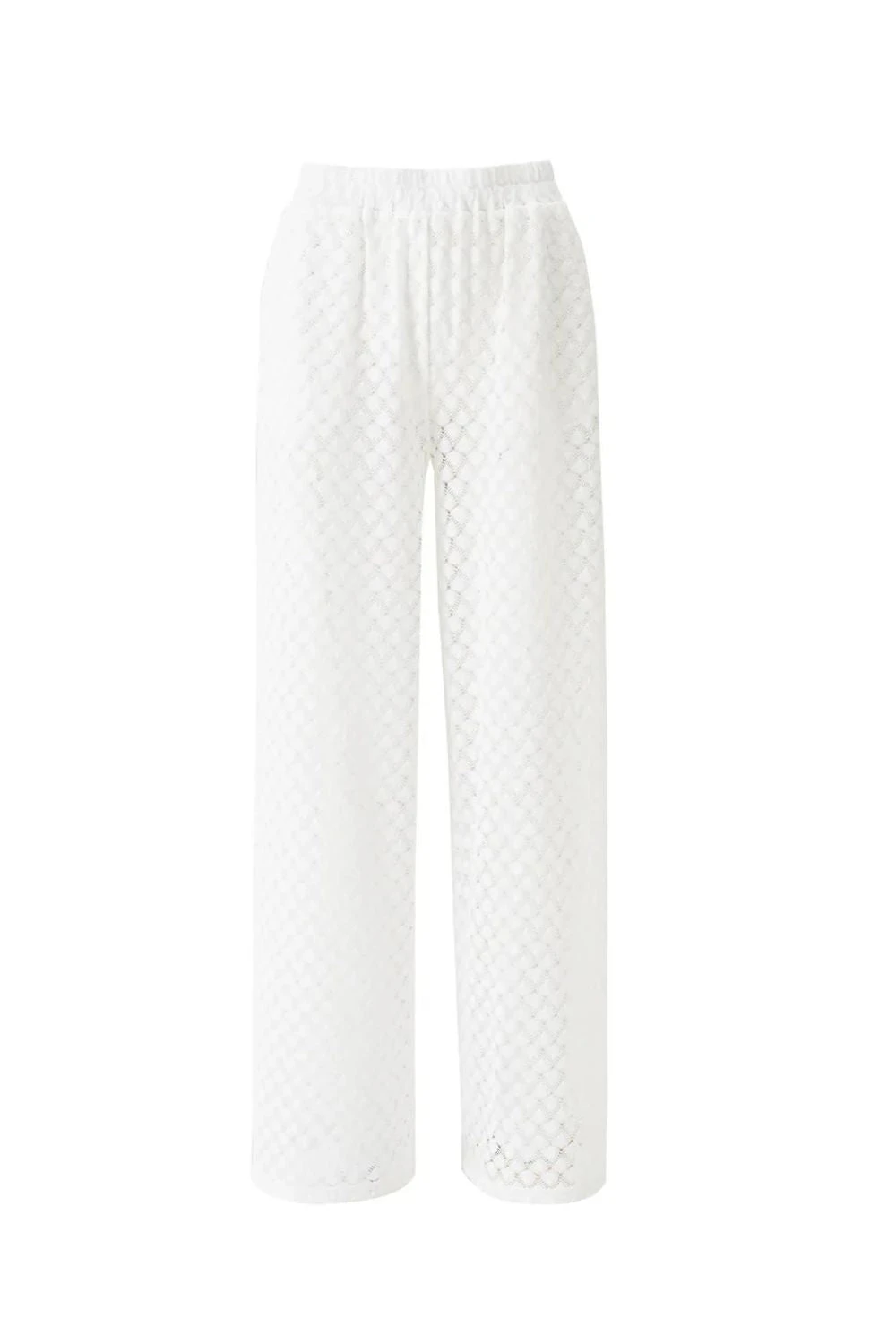 A lacy open knit charms these cover-up pants styled with an elastic waistband and straight legs for easy, flowy movement.