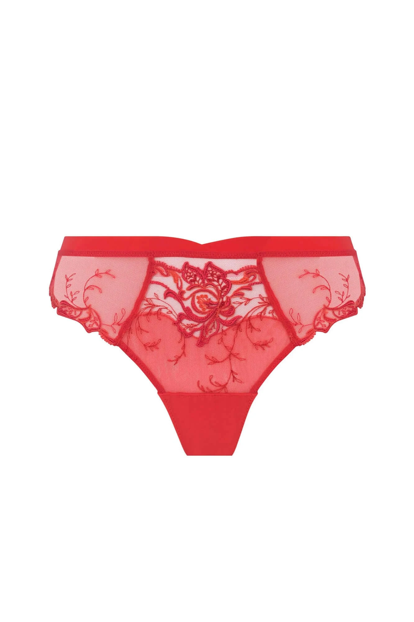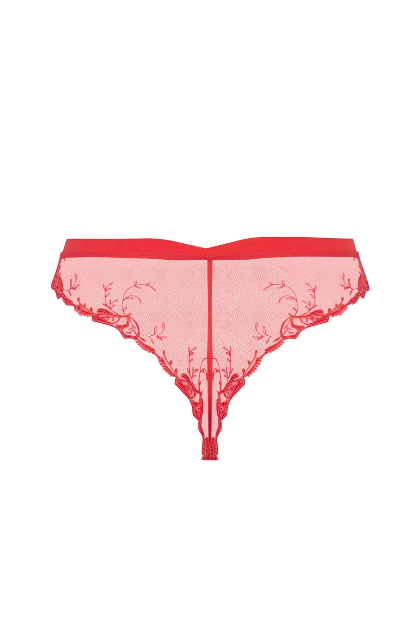 Crafted to gently reveal your curves while remaining invisible under clothing, this thong combines both elegance and functionality. The front features scalloped multithreaded embroidery on tulle, balancing transparency with intricate patterns. The waist, designed with a cross-over detail, is made from a soft, comfortable knit, ensuring a snug fit without compromising on comfort. The back, in a tanga cut, is beautifully finished with scalloped embroidery.